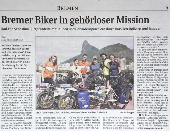 Eine Auswahl der schönsten Artikel über vergangene Tandem-Projekte, alle Bilder von Sebastian Burger Sonntagstip Syke / Germany, 04/16/2006 - Sum-up of the BlindCycle Tour Frankfurter Rundschau, 01/31/2002 about the Come Join Me Tour Kreisbote (Allgäu) / Germany,2002 - teaser for a local slideshow of the Come Join Me tour Weser-Kurier / Germany, 04/16/2006 - Intermediate report on the BlindCycle Tour Bergsträßer Anzeiger, 09/15/2001 intermediate report about the Come Join Me Tour Express, 12/27/1999: report about the Beijing by bike tour Allgäuer Zeitung/i>, 12/12/2001 intermediate report about the Come Join Me Tour Bild-Zeitung (most common yellow pages) from 10/30/1999 about our arrival in Beijing by bike tour Frankfurter Allgemeine Zeitung, 12/08/1999 - article about the Beijing by bike tour Jornal do Brasil / Brasil, 09/15/2009 - intermediate report about the Vamonos Project/ Rio de Janeiro Weser Report / Germany, 03/14/2010 - intermediate report about the Vamonos Project/ Rio de Janeiro El Telégrafo / Ecuador,02/11/2010 - excellent article referring the Vamonos Project Bergsträßer Anzeiger, vom 03/31/2010 über das Vamonos Project |