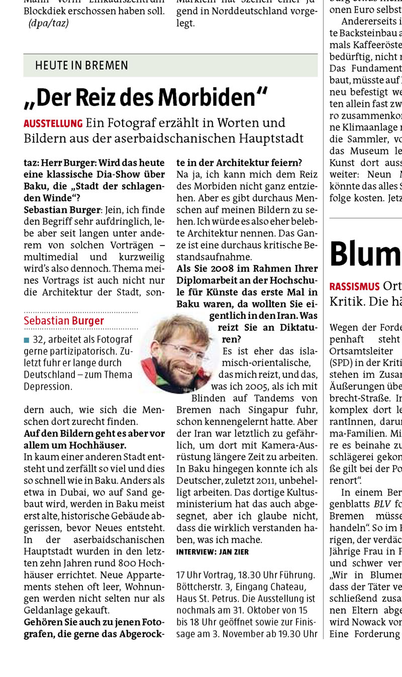 Die TAZ Nord vom 7.10.2012 über die Baku Ausstellung in Bremen